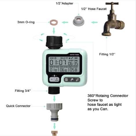 - Trì hoãn thời gian: Hẹn giờ tưới nước có thể lập trình giúp bạn trì hoãn việc tưới nước vào một thời điểm đã định, vì vậy bãi cỏ và khu vườn của bạn luôn ở trong tình trạng tốt nhất.